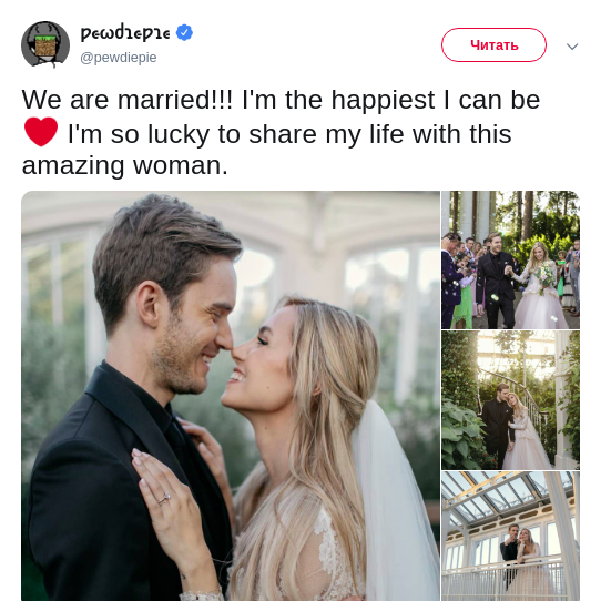 Самый известный видеоблогер в мире Феликс Чельберг, он же PewDiePie, объявил о том, что он женился. Миссис Чельберг стала Марция Бизоньин (Marzia Bisognin). Пара долго была в отношениях. Фото со свадьбы PewDiePie опубликовал в Twitter.
