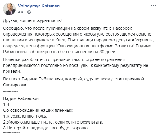 "Об освобождении наших пленных: К сожалению, ложь. Умоляю: меньше пи@ите, если хотите результата. Не теряйте надежду - все будет хорошо",- привел Кацман содержание поста Рабиновича.