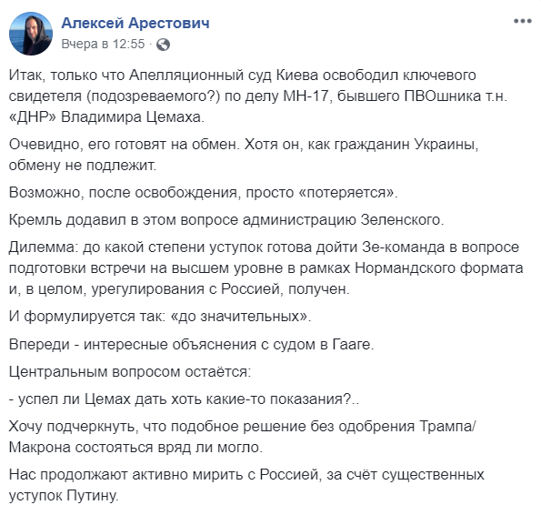 Поэтому, когда Цемаха отпустили из СИЗО с явным прицелом на обмен пленными - многих это возмутило. В соцсетях заговорили о том, что Киев "прогнулся под Путина" и под давлением Москвы отдает ключевого свидетеля Гаагского трибунала.