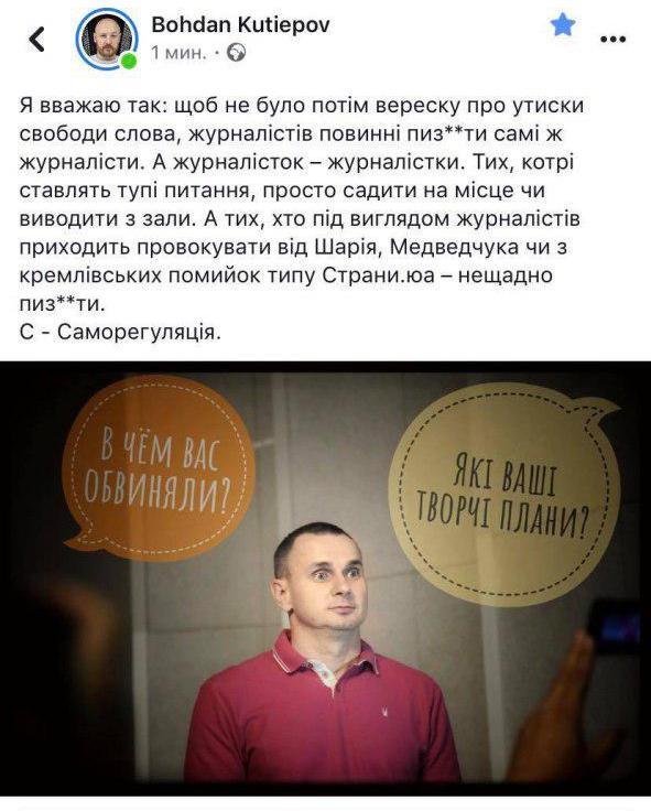 "Я считаю так: чтобы не было потом визга о притеснениях свободы слова, журналистов должны пиз@ть сами журналисты. А журналисток – журналистки. Тех, которые ставят тупые вопросы, просто сажать на место и выводить из зала. А тех, кто под видом журналистов приходит провоцировать от Шария, Медведчука или из кремлевских помоек типа Страны.юа – беспощадно пиз@ть. С – Саморегуляция", – написал Кутепов.