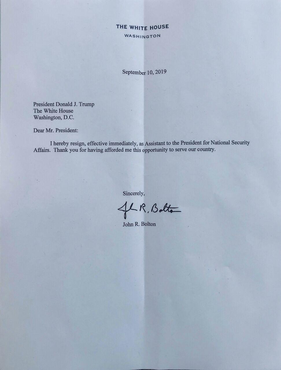 Джон Болтон заявил, что он сам предложил Дональду Трампу подать в отставку. Документ