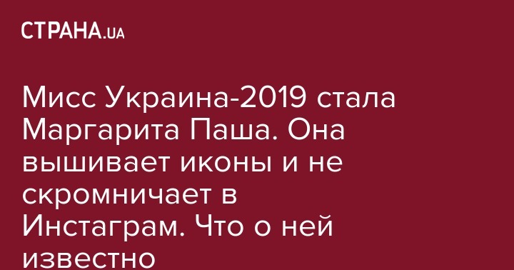 В Украине выбрали победительницу Мисс Украина-2019. Корону главной красавицы получила 24-летняя Маргарита Паша из Харькова. Теперь она представит страну на международном уровне - на "Мисс мира" в Лондоне в декабре этого года. Рост девушки 174 сантиметра, она учится в Киевском институте международных отношений, увлекается йогой, вышивает иконы и может похвастаться званием мастера спорта по художественной гимнастике. А еще не скромничает в Инстаграм и заявляет, что может связать свое будущее с политикой.