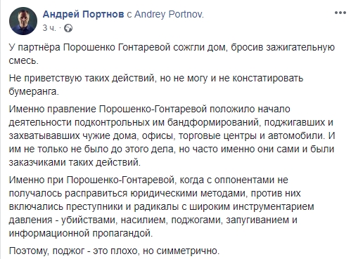 Юрист Андрей Портнов, по чьему заявлению открыто одно из дел против экс-главы НБУ, считает, что произошедшее вполне закономерно: "У партнёра Порошенко Гонтаревой сожгли дом, бросив зажигательную смесь. Не приветствую таких действий, но не могу и не констатировать бумеранга.