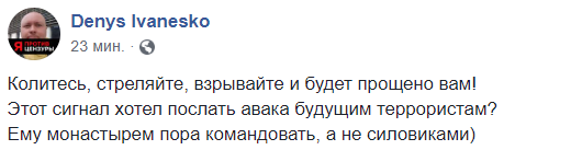 "Колитесь, стреляйте, взрывайте и будет прощено вам! Этот сигнал хотел послать авака будущим террористам? Ему монастырем пора командовать, а не силовиками", - возмущается журналист Денис Иванеско.