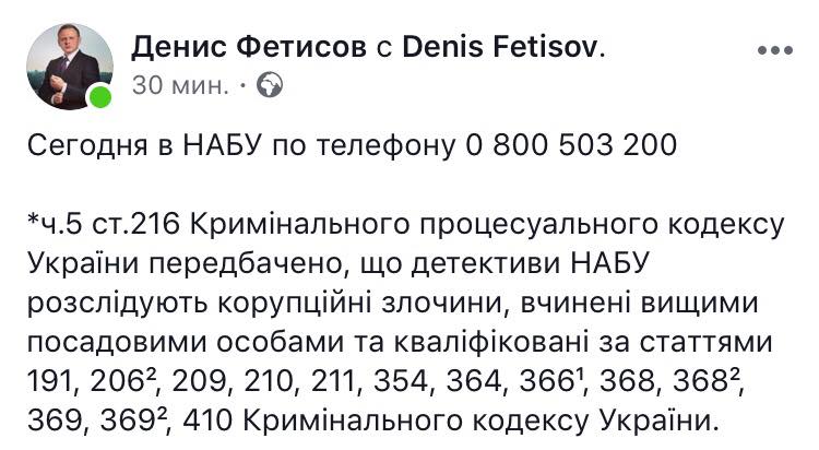 По состоянию на утро вторника, 24 сентября, горячая линия в Национальном антикоррупционном бюро вновь заработала. Как указывает адвокат Денис Фетисов, теперь при попытках граждан дозвониться и сообщить о коррупционном злодеянии, на другом конце трубки заявителя заранее информируют о том, что далеко не все такие случаи может расследовать Бюро.