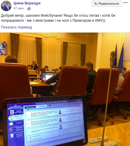 "Добрый вечер, уважаемые Фейсбучане! Если бы кто-то спрашивал и хотел бы поработать - мы с министрами и во главе с премьером в КМУ" - написала Верещук в посте, опубликованном в половине девятого вечера.