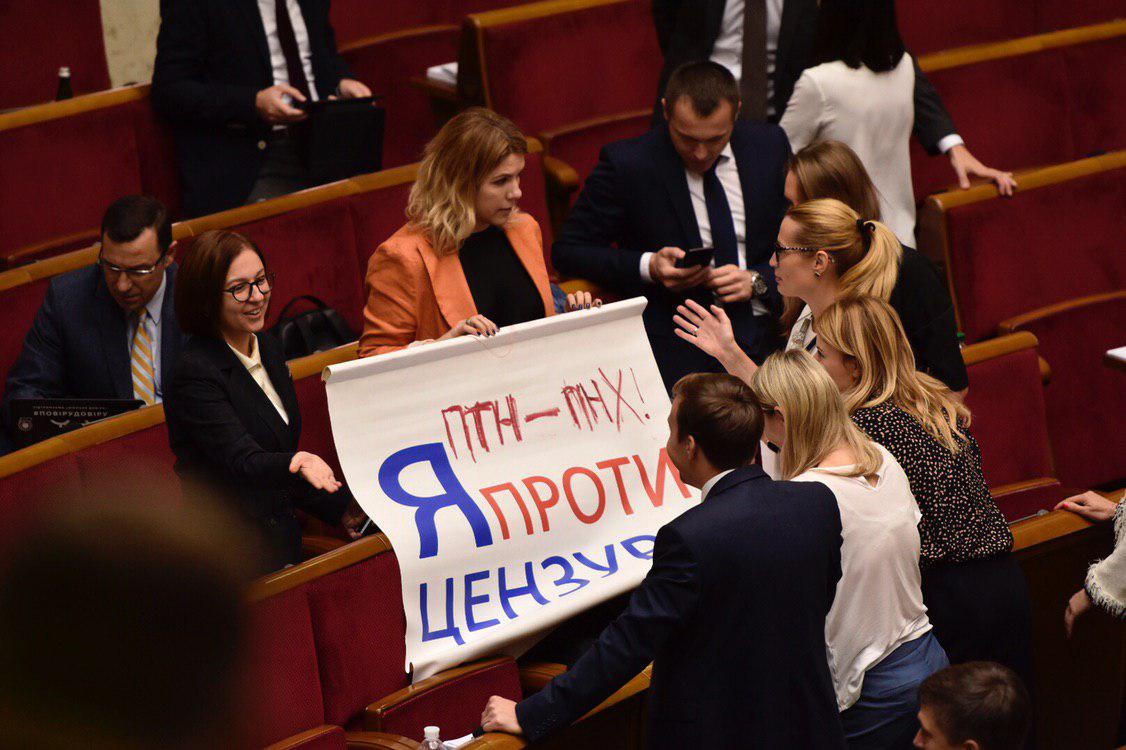 10:15 Нардепы от Оппозиционной платформы Нестор Шуфрич и Вадим Рабинович. Они повесили на трибуне плакат "Я против цензуры"