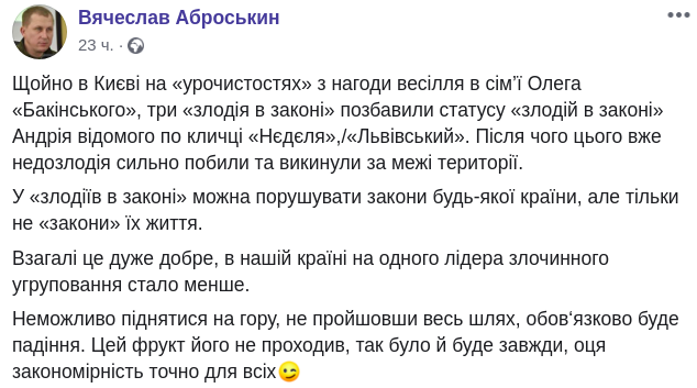 "У "воров в законе" можно нарушать законы любой страны, но только не "законы" их жизни. Вообще это очень хорошо, в нашей стране на одного лидера преступной группировки стало меньше" – написал Аброськин.