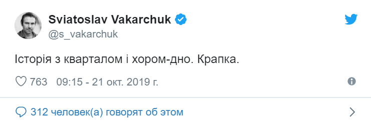 Об этом говорится в твиттер-микроблоге Вакарчука в понедельник, 21 октября. "История с кварталом и хором - дно. Точка", - говорится в опубликованном сообщении.