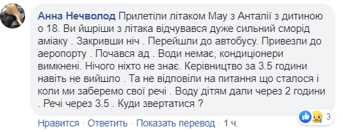 "Прилетели самолетом МАУ из Анталии с ребенком в 18:00. На выходе из самолета чувствовался очень сильный запах аммиака. Закрыв нос, перешли к автобусу. Привезли в аэропорт. Начался ад. Воды нет, кондиционеры выключены. Ничего никто не знает. Руководство за 3,5 часа даже не вышло. И не ответили на вопрос, что случилось и когда мы заберем свои вещи. Воду детям дали через два часа", – пишет Анна Нечволод.