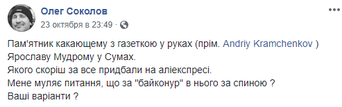 "Памятник какающему с газеткой в руках Ярославу Мудрому в Сумах.Которого скорее всего приобрели на алиэкспрессе. Меня мозолит вопрос, что за "Байконур" у него за спиной?" - писал Олег Соколов.