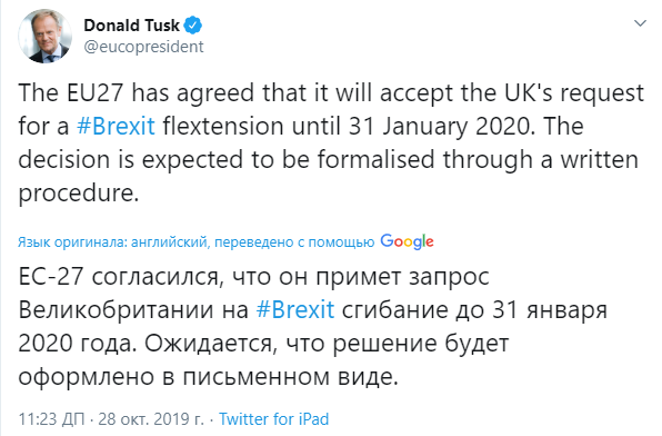 Лидеры стран Евросоюза согласились на просьбу Великобритании о переносе крайнего срока для Brexit с 31 октября на 31 января 2020.Об этом заявил глава Евросовета Дональд Туск в своем микроблоге в Twitter.