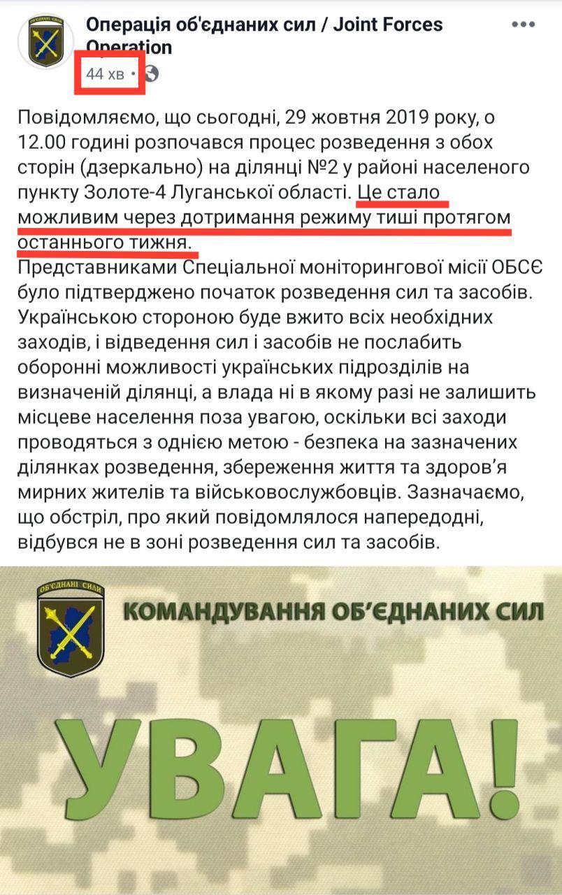 "В 12.00 вторника, 29 октября, в зоне проведения операции Объединенных сил (ООС) на участке №2 в районе населенного пункта Золотое-4 Луганской области начался процесс разведения с обеих сторон (зеркально) сил и средств.