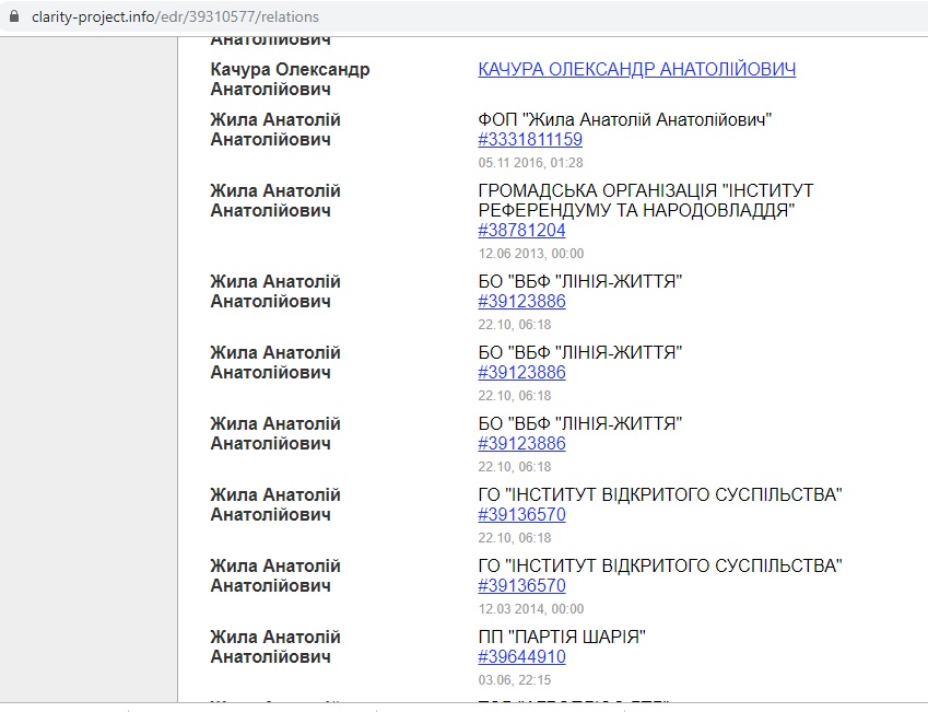 Бывший нардеп также обнаружила, что Качура имеет отношение к партии Шария. "Если смотреть на бизнес-связи Александра Качуры в реестрах предприятий, то легко проследить, что именно он занимался юридическим сопровождением "похода" украинофоба и извращенца Анатолия Шария на выборы в Верховную Раду. Помните, внезапно оказалось, что Партия Шария (созданный проект Портнова для нужд Зеленского) уже три года, как формально существует. Этим занимался лично Александр Качура. Следовательно, это зеленое медведчуковское г ... еще и отец партии Шария", - пишет Чорновол.