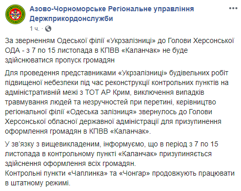 "Для проведения представителями "Укрзализныци" строительных работ повышенной опасности при реконструкции контрольных пунктов на административной границе с АР Крым, исключения случаев травмирования людей и неудобств при пересечении, руководство регионального филиала "Одесская железная дорога" обратилось к главе Херсонской областной государственной администрации для приостановления оформления граждан в КПВВ "Каланчак", - говоритсся в сообщении.
