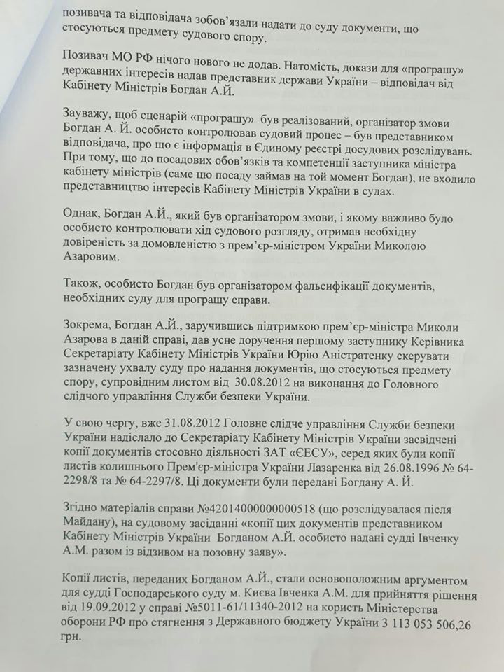 "Измена Украины заключается в том, что Андрей Богдан, будучи должностным лицом КМУ в период 2010-2014 годов, организовал растрату средств государственного бюджета в размере 3 млрд грн в интересах Министерства обороны РФ. Причем следствием преступления Богдана стало финансирование из бюджета Украины вооруженных сил врага в период его подготовки к нападению на Украину, оккупации и аннексии Крыма (ведь 36 млн грн на счета МО РФ были перечислены в 2013 году). Это как раз подследственность СБУ ", - сообщила Чорновол и прикрепила скрины заявления на 7 страницах.
