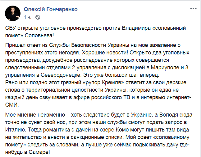 Гончаренко показал ответ СБУ про дело на российского телеведущего Соловьева и хочет лишить его виллы в Италии