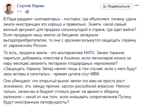 Они убеждают, что открытый рынок земли это вам не просто рост экономики, это, между прочим, заслон от российской агрессии. Неясно только, зачем мы в бюджет столько денег на армию и оборону заложили - какой от них толк, если оказывать сопротивление Путину будут иностранные латифундисты?" - говорится в сообщении.