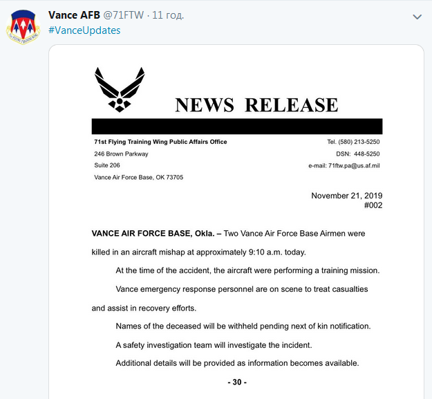 Об этом сообщило командование авиабазы Вэнс в Twitter.