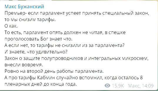 "Премьер: если парламент успеет принять специальный закон, то мы снизим тарифы. О как. То есть парламент опять должен не читая, в спешке проголосовать Бог знает что. А если нет, то тарифы не снизили из-за парламента? И знаете, что удивительно? Закон о защите полупроводников и интегральных микросхем внесли вовремя. Ровно на второй день работы парламента. А про тарифы Кабмин случайно вспомнил, когда осталось 8 пленарных дней до конца года", – написал Бужанский.