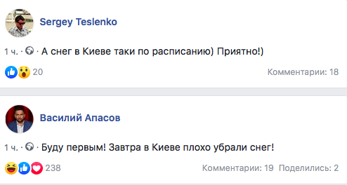 Также киевляне шутят о том, что снег пошел по расписанию и пишут такие посты: "Буду первым! Завтра в Киеве плохо убрали снег!"
