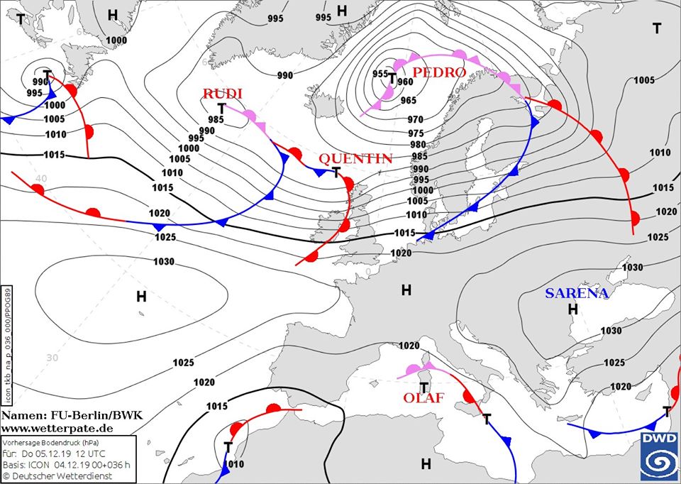 "Над Атлантикой – Азорский антициклон над Черным морем – антициклон Sarena, на севере Европы – мощный циклон Pedro с друзьями, над Средиземноморьем – циклон Olaf. Карта 1.