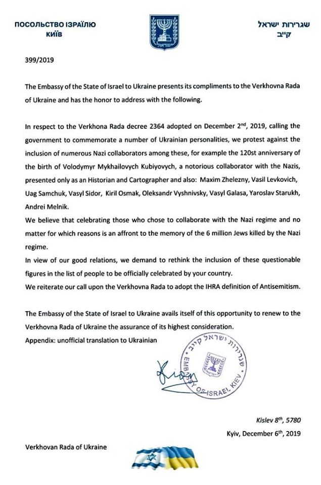 "Официальный протест посла Государства Израиль Джоеля Лиона в связи с решением Верховной Рады отметить юбилеи ряда нацистских коллаборантов: