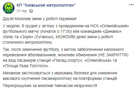 "В воскресенье, 8 декабря в связи с проведением на НСК "Олимпийский" футбольного матча (начало в 17:00) между командами "Динамо" (Киев) и "Заря" (Луганск), возможны некоторые изменения в работе столичного метрополитена. Механизм применяется из соображений безопасности во избежание массового скопления пассажиропотока на платформах станций. Приносим извинения за возможные временные неудобства!" , - говорится в сообщении.