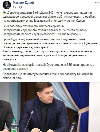 "Поручил выделить 2 млн 240 тысяч грн для одноразовой денежной помощи семьям погибших и лицам, пострадавшим в результате пожара в колледже в центре Одессы. Семьи погибших получат 100 тысяч грн", - написал губернатор.