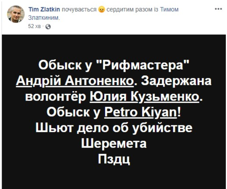 "Обыск у "Рифмастера" Андрей Антоненко. Задержана волонтёр Юлия Кузьменко. Обыск у Петра Кияна! Шьют дело об убийстве Шеремета", - сообщает Тим Златкин.