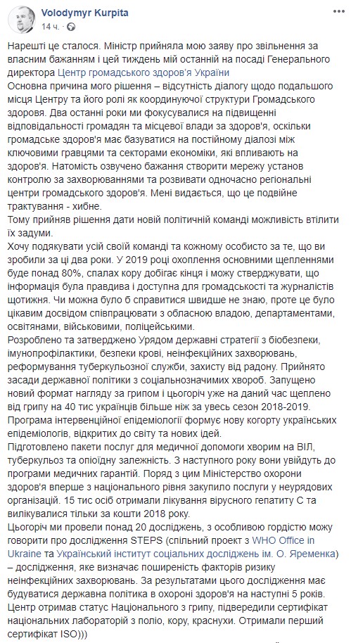 Гендиректор Государственного учреждения "Центр общественного здоровья МОЗ Украины" Владимир Курпита ушел в отставку. Об этом он сообщил в Facebook.