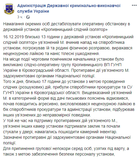 "В тот же день, около 17:00 в учреждение с целью проведения следственных (розыскных) действий, прибыли сотрудники прокуратуры и СУ ГУНП Украины в Кировоградской области. Вышеуказанный заключенный М. в категорической форме от дачи письменных объяснений отказался, начал вести себя агрессивно, выражался нецензурной бранью в сторону сотрудников прокуратуры и администрации учреждения, подстрекал других заключенных к неправомерному поведению", - говорится в сообщении.