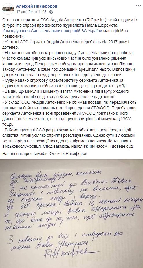 В посте говорится: "Относительно сержанта УСН Андрея Антоненко (Riffmaster), который является одним из фигурантов дела об убийстве журналиста Павла Шеремета, Командование Сил специальных операций ВС Украины должен официально сообщить:
