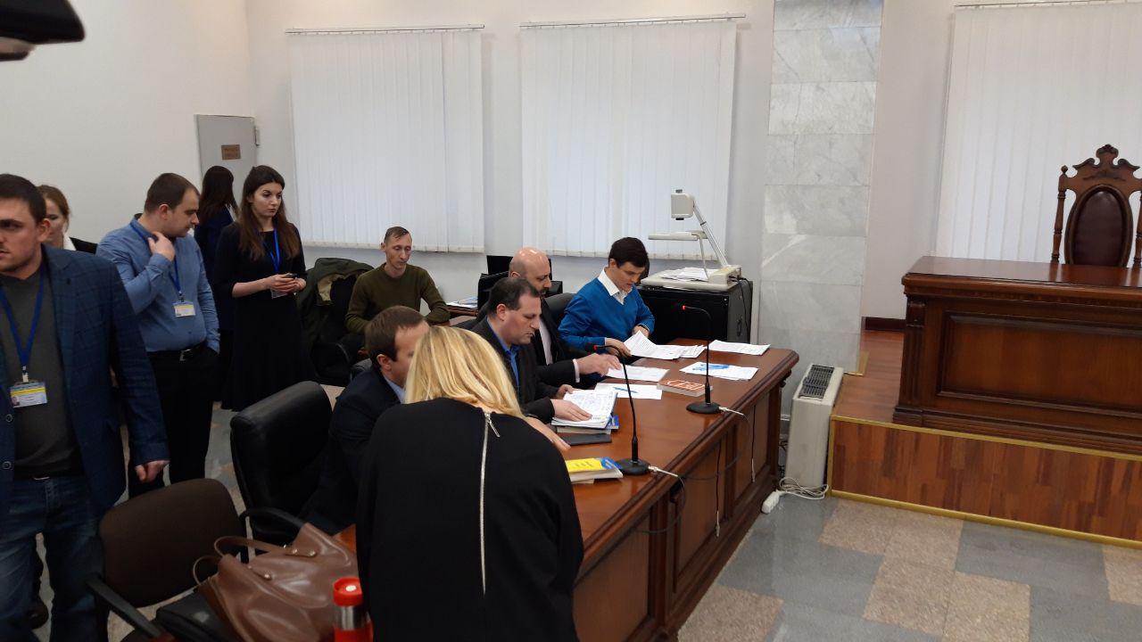 17:32 От Рябошапки пришло письмо о смене группы прокуроров, пришло три прокурора (на фото три человека за сидящими). Суд рассматривает вопрос о замене прокуроров