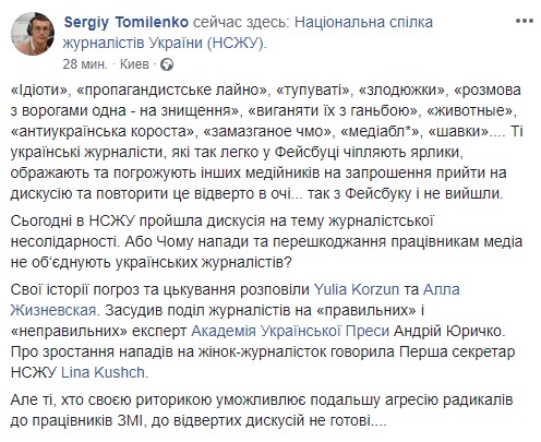 "Идиоты", "пропагандистское дерьмо", "туповатые", "воришки", "разговор с врагами один - на уничтожение", "выгонять их с позором", "животные", "антиукраинская чесотка", "замазганое чмо", "медиабл*", "шавки".... Те украинские журналисты, которые так легко в Фейсбуке вешают ярлыки, оскорбляют и угрожают другим медийщикам на приглашение прийти на дискуссию и повторить это откровенно в глаза... так из Фейсбука и не вышли", - отмечает глава НСЖУ.