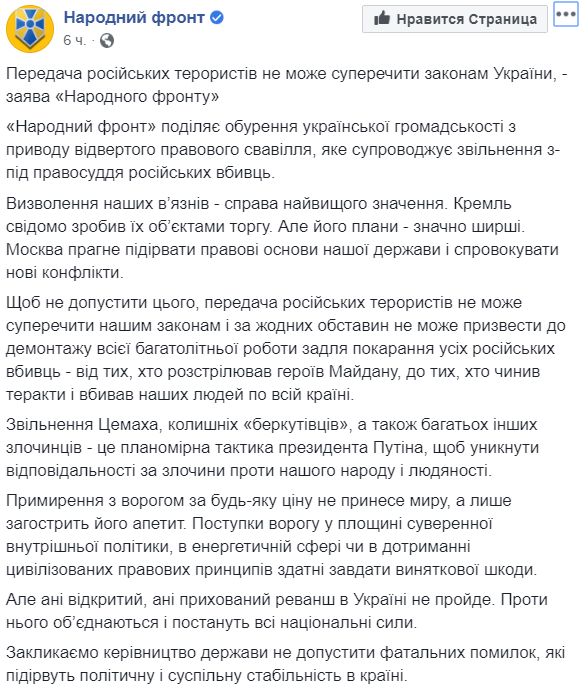 В "Народном фронте" тоже считают, что нельзя менять пленных и допускать "демонтаж всей многолетней работы для наказания всех российских убийц - от тех, кто расстреливал героев Майдана, к тем, кто совершал теракты и убивал наших людей по всей стране".