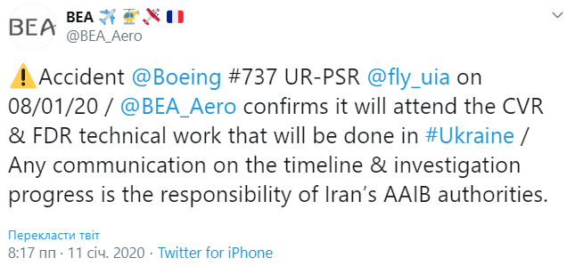Также в пресс-службе бюро заявили, что за любые вопросы относительно времени и прогресса расследования отвечают иранские власти.