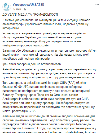 После того, как многие СМИ Украины опубликовали претензии и обвинения в адрес Украэроруха из-за того, что госпредприятие не запретило полеты украинских самолетов в воздушном пространстве Ирана, компания выступила с заявлением и объяснением своей позиции.