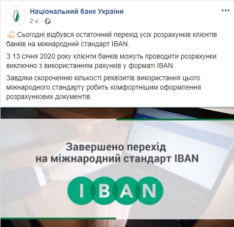 В понедельник, 13 января, завершился окончательный переход всех расчетов клиентов банков на международный стандарт IBAN. Об этом сообщает пресс-служба НБУ в Facebook.