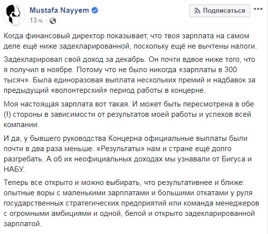 Заместитель генерального директора "Укроборонпрома" Мустафа Найем утверждает, что не получал зарплату в 300 тысяч гривен.Об этом он написал на своей странице в Facebook.