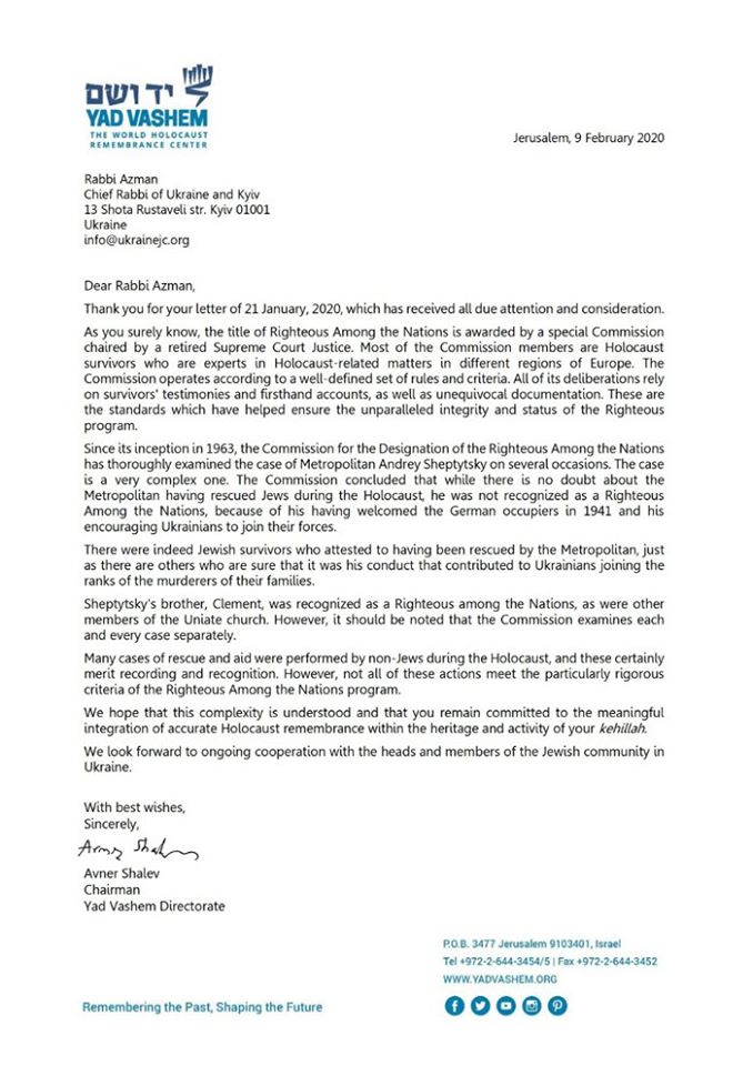 Организация тоже вспомнила, что к рядам праведников был причислен брат Шептицкого Клемент и "другие священники униатской церкви" (так в тексте письма названа УГКЦ). При этом не все укрывавшие евреем могут иметь такой статус. Поэтому каждый случай комиссия рассматривает отдельно.