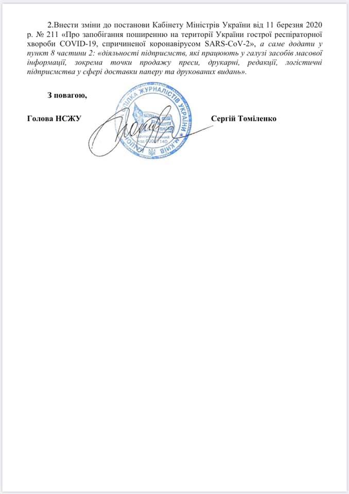 Для обеспечения доступа населения Украина к информации НСЖУ призвал Кабмин внести изменения в свое постановление от 11 марта "О предотвращении распространения на территории Украины острой респираторной болезни COVID-19, вызванной коронавирусом SARS-CoV-2" и добавить точки продажи прессы, редакции и логистические предприятия в сфере доставки бумаги и печатных изданий в перечень исключений.