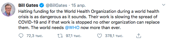 В день, когда президент США объявил о приостановке финансирования ВОЗ, Гейтс написал твит такого содержания: