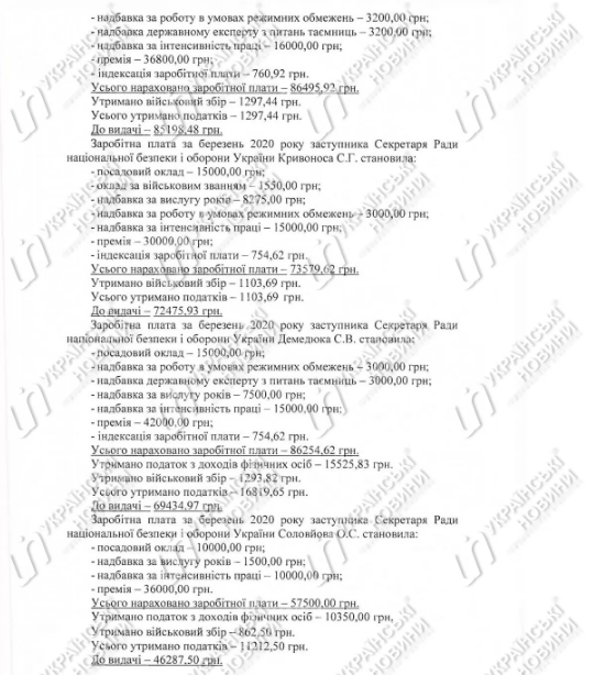 У одного из его заместителей, Алексея Соловьева, который работает в СНБО с 25 февраля, зарплата за март была незначительно ниже - 57,5 тысяч гривен начисленных и 46,3 тысяч выданных.