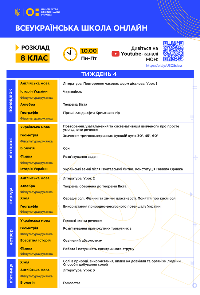 "Друзья, надеемся, что вы проснулись и уже радуетесь новому дню! Ведь уже в 10.00 стартует 4 неделя Всеукраинской школы онлайн. Все уроки на сегодня уже запланированы на YouTube МОН. Традиционно делимся с вами расписанием на неделю, где заранее указаны темы каждого урока. Также напоминаем, что для вашего удобства работают отдельные списки воспроизведения для каждого класса, просто кликайте на нужную вам ссылку…", - говорится в сообщении.