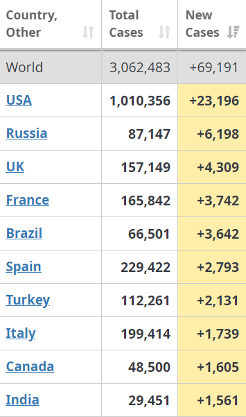 Статистика коронавируса преодолела новый психологический барьер - число заболевших в мире превысило отметку в три миллиона человек. Из них почти один миллион - жители США.