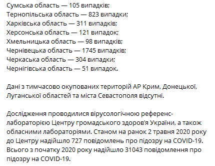 Исследования проводились вирусологической референс-лабораторией Центра общественного здоровья Украины, а также областными лабораториями. По состоянию на утро 2 мая 2020 в Центр поступило 727 сообщений о подозрении на Covid-19. Всего с началу 2020 года поступило 31043 сообщение о подозрении на Covid-19.