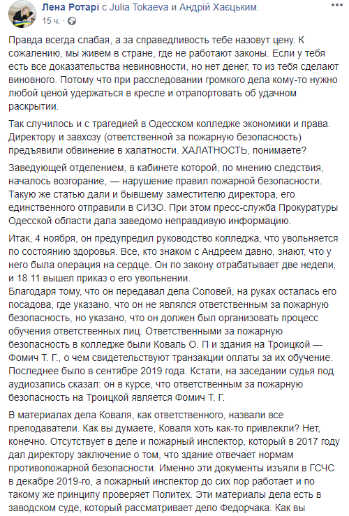"Благодаря тому, что он передавал дела Соловей (замдиректора по АХЧ на время пожара - Ред.), на руках осталась его посадова, где указано, что он не являлся ответственным за пожарную безопасность, но указано, что он должен был организовать процесс обучения ответственных лиц. Ответственными за пожарную безопасность в колледже были Коваль О. П и здания на Троицкой - Фомич Т. Г., о чем свидетельствуют транзакции оплаты за их обучение. Последнее было в сентябре 2019 года. Кстати, на заседании судья под аудиозапись сказал: он в курсе, что ответственным за пожарную безопасность на Троицкой является Фомич Т. Г.", - пишет Елена Ротари. Также она опубликовала скрины транзакций об оплате обучения ответственных за пожарную безопасность сотрудников колледжа.