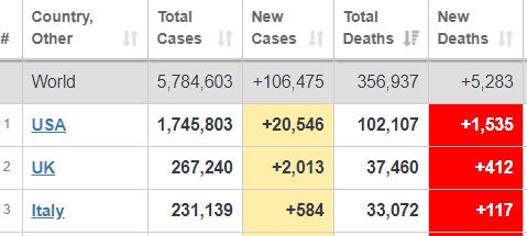 Во всем мире число случаев заражения коронавируса превысила 5,7 миллиона, а количество смертей превысило 350 000 человек.