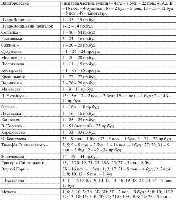 В жилых массивах Новобеличи, Никольская Борщаговка, Нивки и Галаганы, Виноградарь, Святошин, Академгородок и Беличи, а также поселках Горенка и Пуща-Водица возможны временные перебои с водоснабжением. Вода может отсутствовать на верхних этажах зданий, поэтому жителям стоит заранее сделать запас, которого хватит на 2 дня.